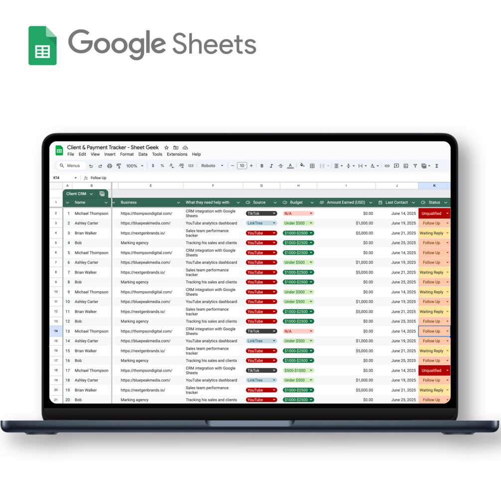 Track clients, conversations, and cash. All in one simple Google Sheet.